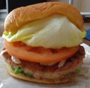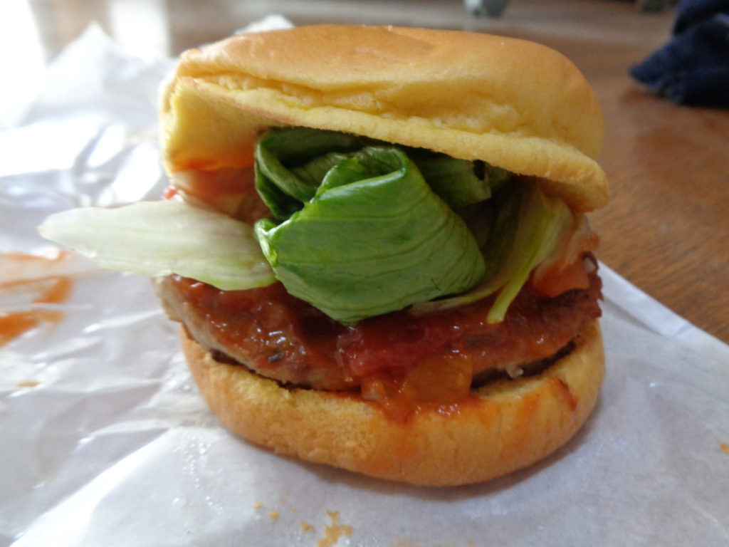 私が行ったのはまだ11時過ぎでしたが、それでも店内には結構な人がいて、テイクアウトでも並んでました。今回は昼は家でということで、「サルサバーガー」と「ガーデンサラダバーガー」の2つを頼みました。お客さんは、どうみても70歳は越えていそうなおっちゃんから10代の女性まで幅広い年齢層に人気があるようです。